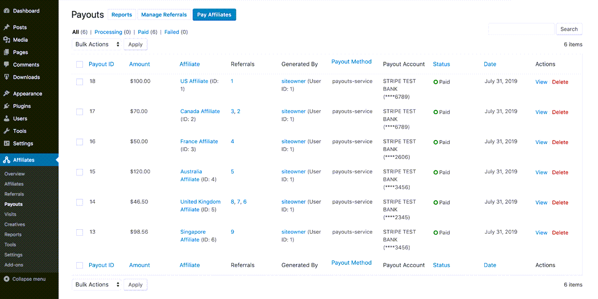 إن هذا الحل مثالي لمطوري WordPress الذين ينشئون مواقع التجارة الإلكترونية والعضوية على أساس منتظم للعملاء. إنها بسيطة وموثوقة ومعقولة التكلفة. الأهم من ذلك، يمكنك إدارة كل شيء من واجهة المستخدم ووردبريس، بما في ذلك إرسال المدفوعات الى الشركاء التابعين. ولا تحتاج إلى تسجيل الدخول إلى تطبيق آخر.