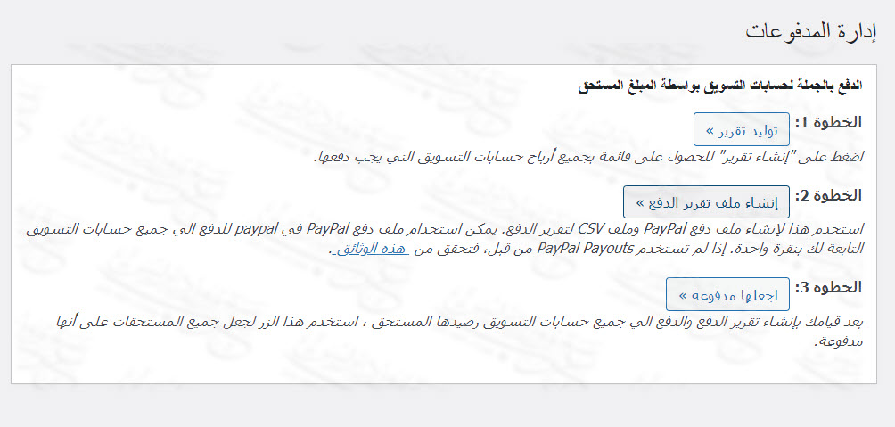 عبر هذه الخطوة يمكنك دفع المبالغ المستحقة للمسوقين دفعة واحدة، ويتم ذلك في 3 خطوات: