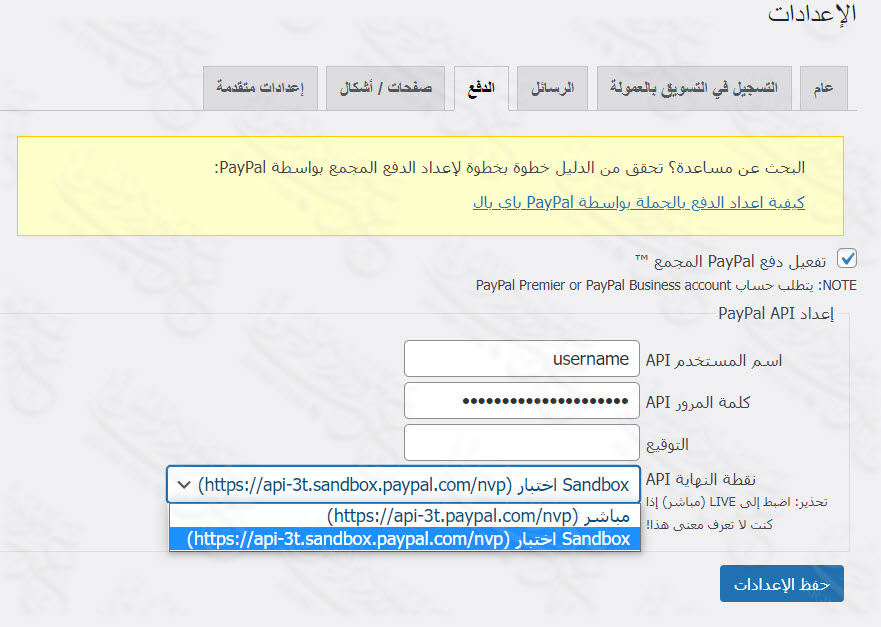 تحدثنا في الخطوة رقم 5 عن تفعيل خاصية دفع المستحقات باستخدام PayPal Mass Pay، وهذا هو المكان الذي تضع فيه البينات المطلوبة لربط باي بال الأعمال الخاص بك.