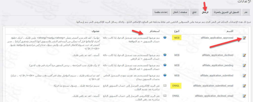 في لمحة واحدة، ستجد أن كل رسالة موضح بجانبها المحتوى الموجود بها، ومتى تستخدم، وما ونوعها؛ فمثلا الرسالة التي اسمها (affiliate_application_approved) نوعها ويب، وتستخدم في حالة تمت الموافقة على المسوق وتظهر فور تسجيل الدخول.