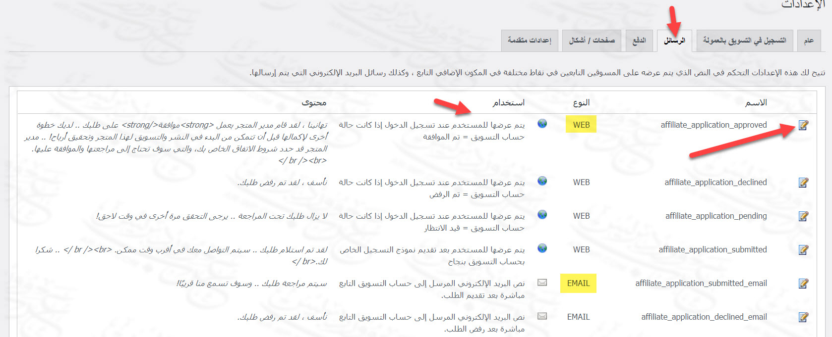 عبر هذه الصفحة يمكنك التحكم في النص الذي يتم عرضه على المسوقين بالعمولة حسب كل حالة، إما مباشرة على موقع الويب أو رسائل البريد الإلكتروني المرسلة للمشتركين، وللتعديل تضغط على رمز القلم.