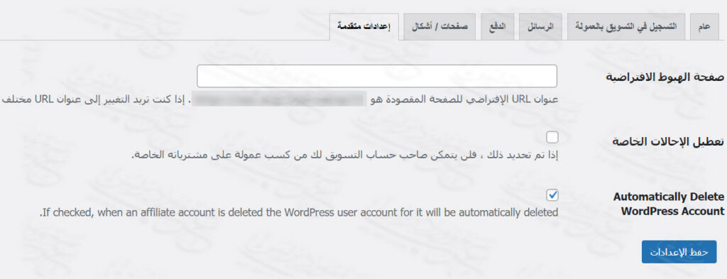 من هذه الإعدادات يمكنك اختيار رابط صفحة الهبوط الأساسية لروابط الإحالة. كما يمنك تعطيل الإحالات الخاصة والتي بتفعيلها لن يتمكن المسوق من كسب عمولة على الإحالات الخاصة به التي يشتريها بنفسه. كما يمكن حذف أحد حسابات التسويق تلقائيًا من الووردبريس بمجرد حذف المسوق.