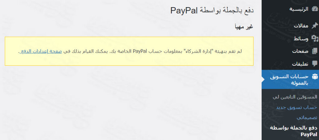 عبر هذا التاب يمكنك تفعيل طريقة دفع المال بالجملة باستخدام PayPal مباشرة، وهذه الخطوة تحتاج لمتطلبات وإعدادات. المتطلبات أن يكون حسابك على باي بال من النوع Business كما يجب تفعيل الـ API الخاص بـ PayPal Mass Pay.