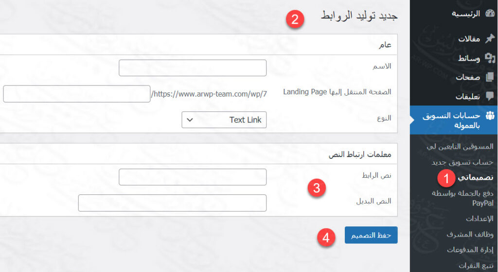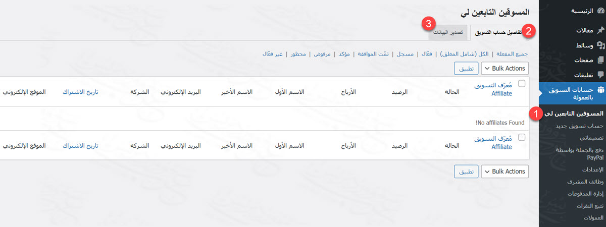 - تظهر الإضافة في الشريط الجانبي تحت اسم Affiliates لمن لديهم ووردبريس إنجليزي، وباسم حسابات التسويق بالعمولة للذين يعملون على ووردبريس بالعربي.