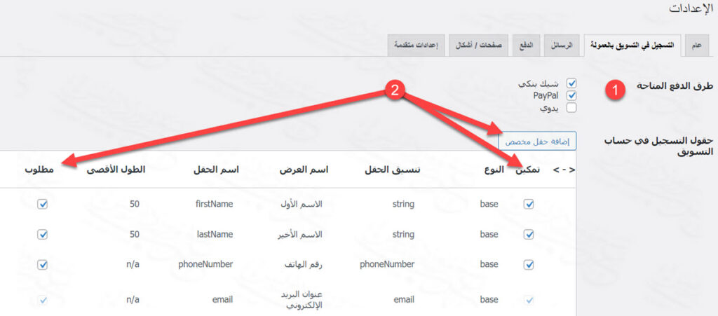 من هذا التاب يمكنك تحديد البيانات المطلوبة من المنتسبين في نموذج التسجيل، فمثلا يمكنك تحديد أنظمة دفع المستحقات المتوفرة والخيارات المتاحة هي الشيك – باي بال – التسليم اليدوي.