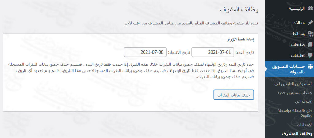 - يمكنك تحديد تاريخ البدء وتاريخ الانتهاء وفي هذه الحالية سيتم حذف بيانات النقرات من بداية التاريخ الأول وحتى التاريخ الثاني.