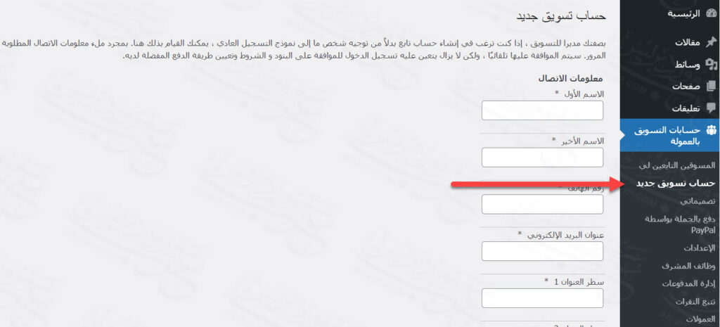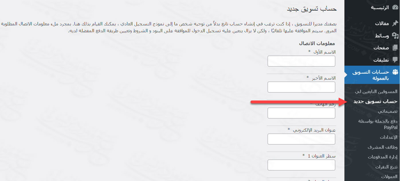 الطبيعي أن الأشخاص المهتمين ببرنامج أفيليات متجربك، هم من يذهبون إلى صفحة التسجيل، ولكنك كمدير لبرنامج التسويق بالعمولة، يمكنك تخطي ذلك وإضافة حساب جديد بنفسك بشكل يدوي باستخدام بيانات المسوق.