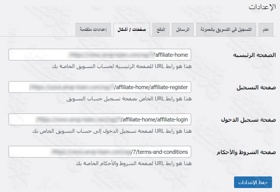 الإضافة تنشئ تلقائيًا مجموعة من الصفحات الضرورية، وهي الصفحة الرئيسية لحساب التسويق بالعمولة، وصفحة تسجيل مسوق جديد، وصفحة تسجيل الدخول، بالإضافة إلى ربط صفحة الشروط والأحكام الخاصة بك.