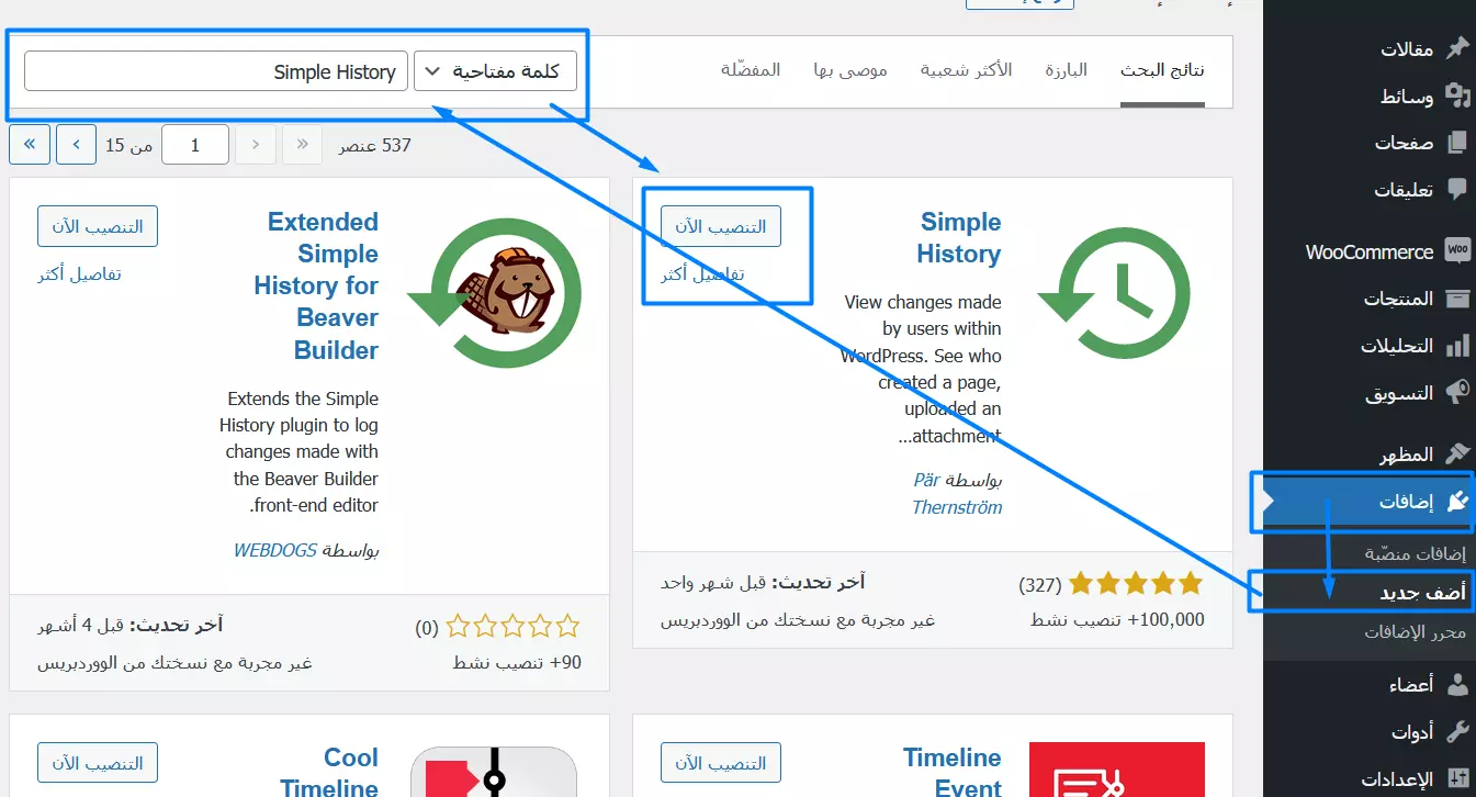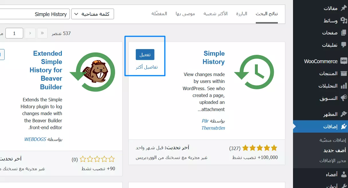 ولكي تبدأ في استخدام إضافة Simple History فإن أولى خطواتك تكمن في تنصيب الإضافة، وذلك إما عبر تحميلها من الرابط الرسمي المشار إليه أعلاه ومن ثم رفعها إلى لوحة التحكم، أو بالبحث عنها مباشرةً من خلال لوحة التحكم.