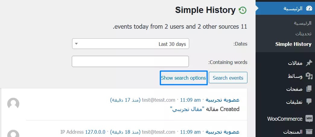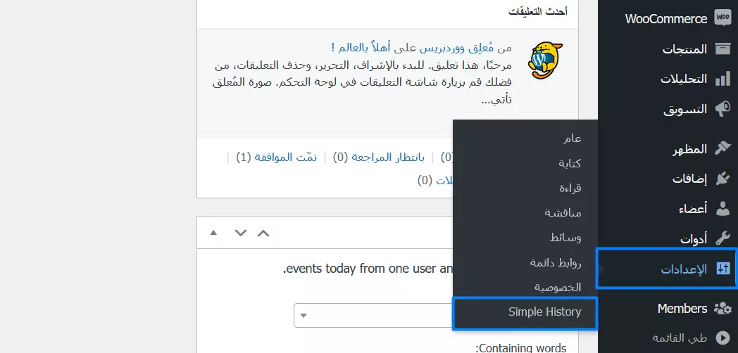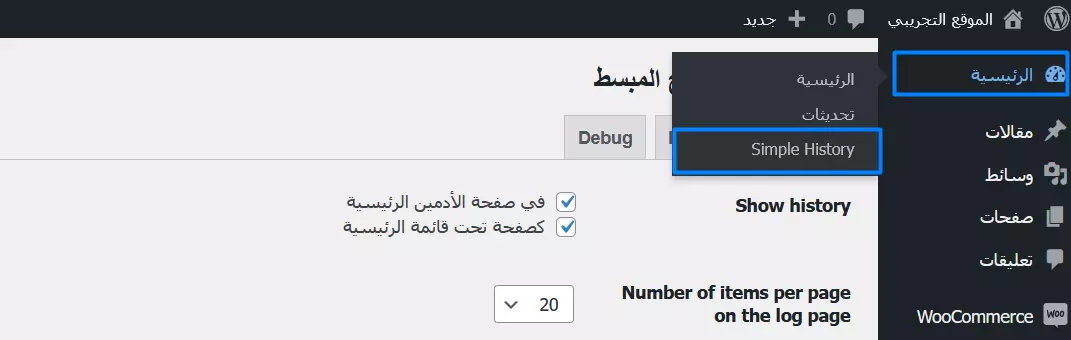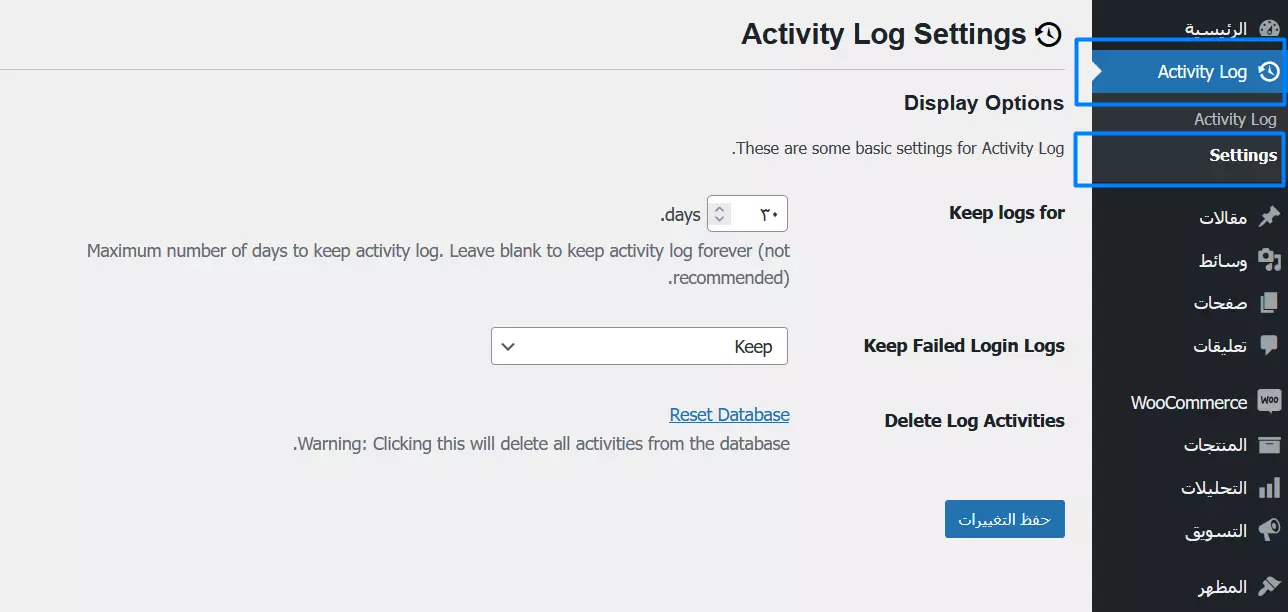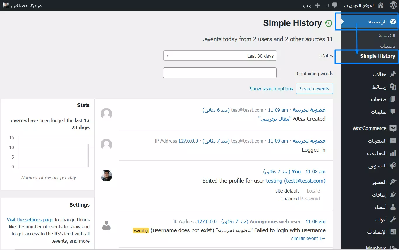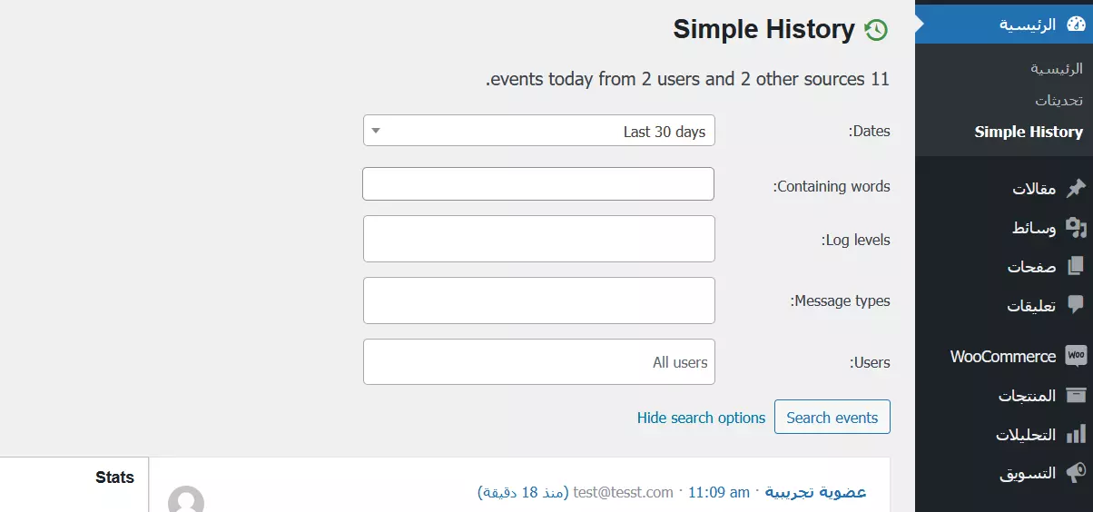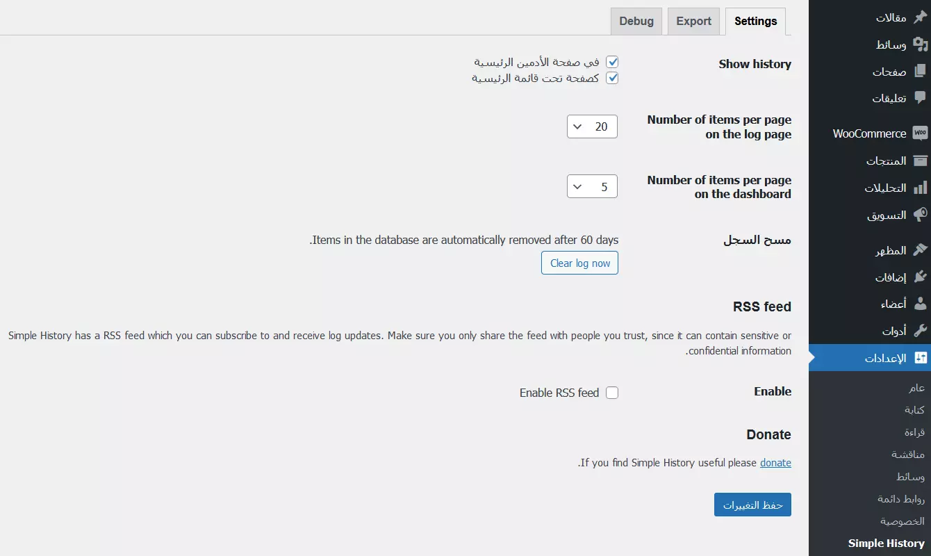 وكما تلاحظ فإن الإعدادات بسيطة إلى حد كبير، وذلك نظرًا لأن إضافة Simple History هي الإضافة الأبسط ضمن الإضافات التي تقوم بنفس المهمة.