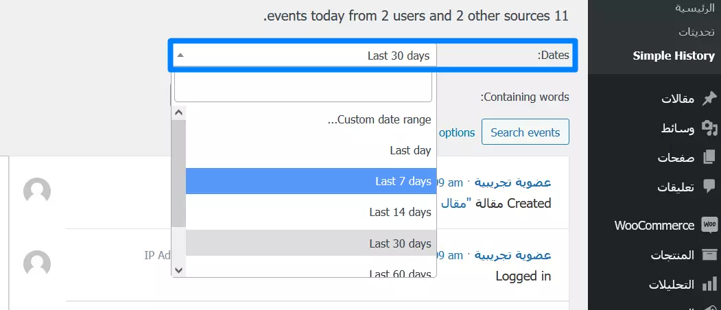 ولاحقًا يمكنك التوجه إلى صفحة الإضافة الرئيسية، ومن خلالها يتم عرض كافة السجلات مع عدد من المرشحات التي يمكنك استخدامها بحريتك الكاملة لمطالعة كافة التغييرات، وذلك بشكل مشابه لما سلف ذكره عند الحديث عن إضافة Simple History: