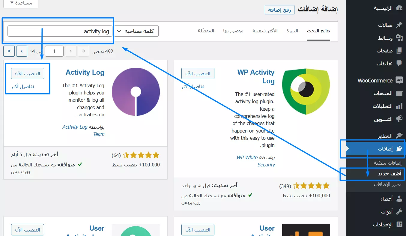 ولكن ونظرًا لأهمية تتبع الأنشطة في ووردبريس سنتناول إضافة Activity Log أيضًا. وتبدأ عملية استخدامها، مثلها مثل أي إضافة أخرى، بالبحث عنها وتنصيبها كما شرحنا سابقًا، أو عبر الخطوات التالية: