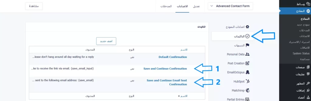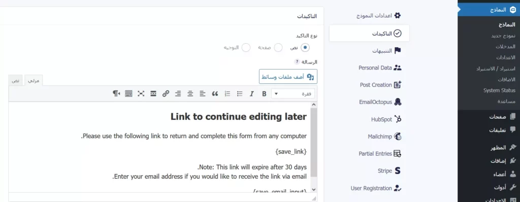 - بعد ذلك اذهب إلى صفحة "تأكيدات" الموجودة داخل قائمة الإعدادات الخاصة بالنموذج، حتى تضبط إعدادات الإشعارات التأكيدية، التي تظهر للعميل عند نقره على رابط "الحفظ والمتابعة لاحقًا".