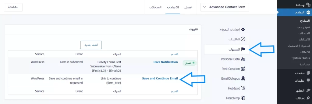 - كذلك بإمكانك الذهاب إلى صفحة "تنبيهات"، حتى تُخصص رسائل البريد الإلكتروني، الذي يرسلها الموقع إلى العملاء تلقائيًا، عند كل عملية إرسال للنموذج.