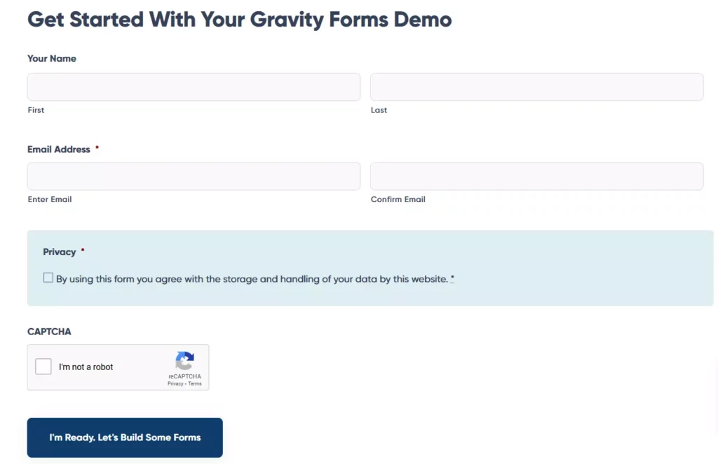 - املأ الحقول المطلوبة بالبيانات المناسبة لها، ووافق على شروط الخصوصية، ثم انقر في النهاية على زر "I'm Ready. Let's Build Some Forms".