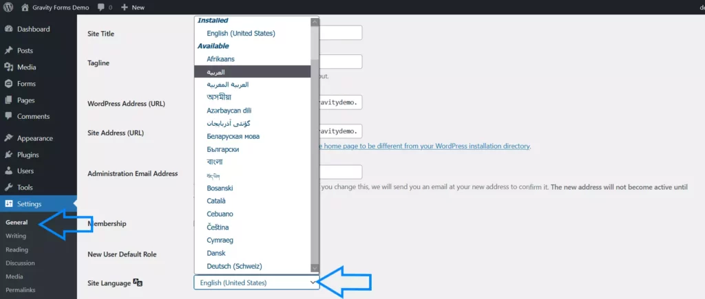 - تُعد اللغة الإنجليزية هي اللغة الافتراضية. لذا، إذا كنت لا تشعر بالارتياح في تعاملك مع لغة الموقع الافتراضية، بإمكانك تغييرها إلى العربية. يُمكنك تنفيذ تلك المهمة عن طريق الذهاب إلى صفحة "General" من قائمة "Settings"، ثم التمرير إلى أسفل لتغيير اللغة.