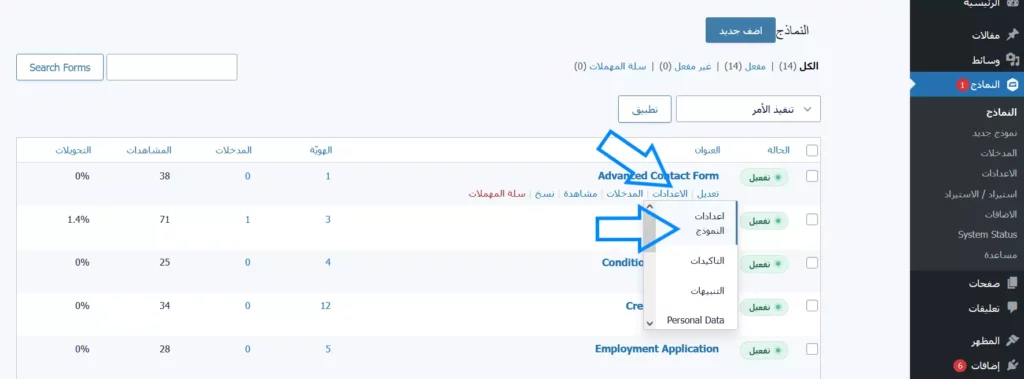 - إذا كنت تريد تفعيل خاصية حفظ البيانات في نموذج ووردبريس أنشأته من قبل، إذًا تستطيع اختيار النموذج من ضمن النماذج الموجودة في صفحة "Forms".