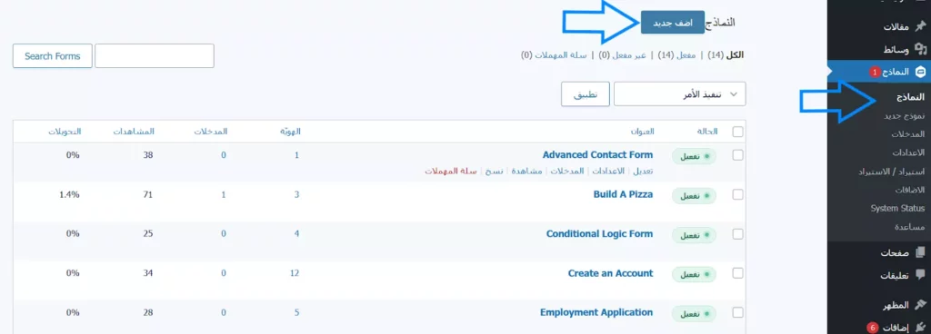 - بداية، اذهب إلى قائمة "النماذج"، أو "Forms"، وانقر على صفحة النماذج. في حال كنت تريد إنشاء نموذج جديد، يُمكنك حينها النقر على زر "أضف جديد"، أو "Add New" وإنشاء النموذج الذي ترغب به.