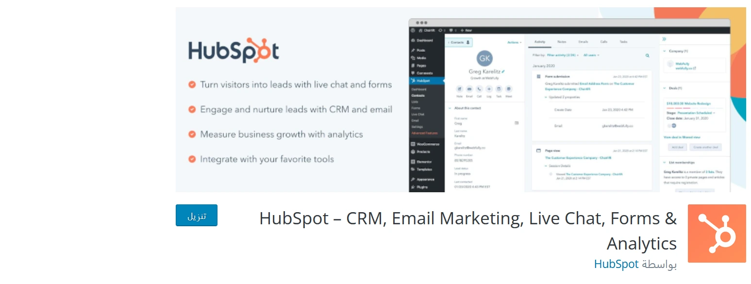 تُعد إضافة HubSpot من الإضافات الأكثر شهرة، التي تساعد على تقديم خدمة دعم مميزة للعملاء، من خلال الإمكانيات الرائعة، التي تضيفها إلى موقعك على الووردبريس، مما يحسّن من نمو مشروعك التجاري، ويزيد من معدل التحويل. لذا، بفضل تلك الإضافة، تشمل خدمة العملاء الخاصة بموقعك على الخصائص التالية: