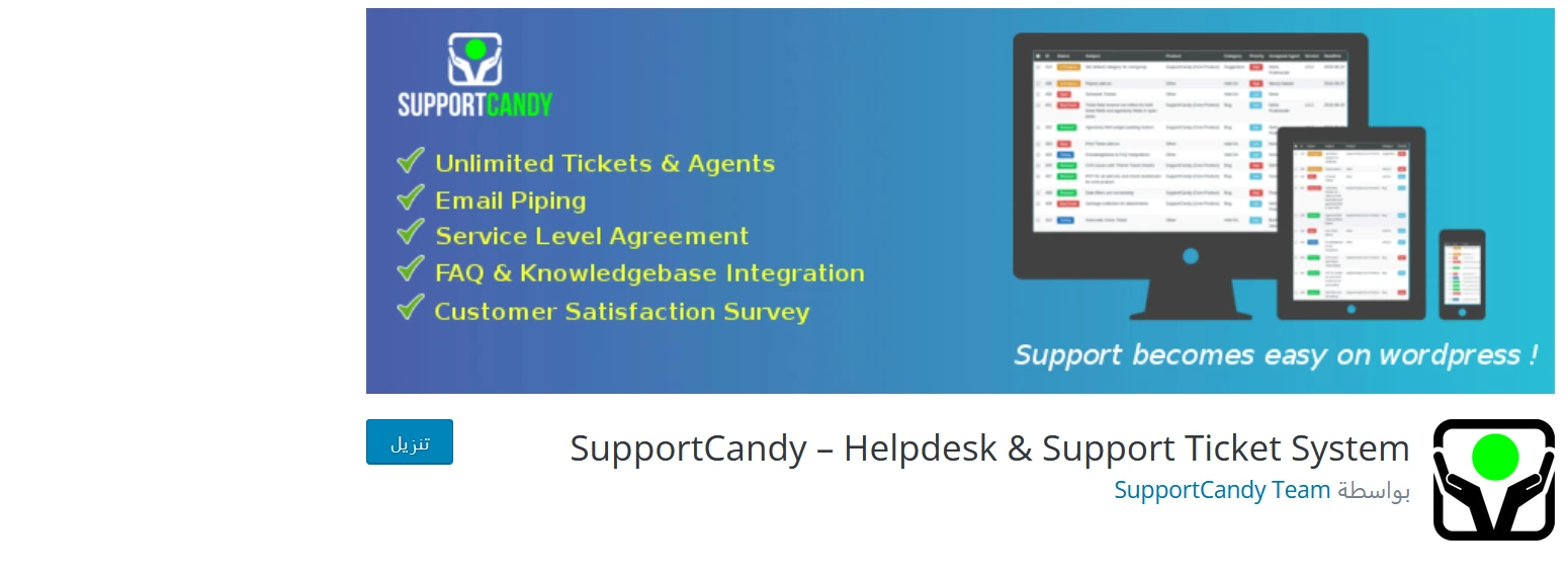 تستطيع إضافة SupportCandy المجانية كذلك بناء نظام شامل ومتكامل خاص بخدمة العملاء، بالإضافة إلى كونها إضافة سهلة التشغيل والاستخدام. لذا، فهي توفّر الوظائف اللازمة، مع الحفاظ على تنفيذ المهام والخطوات المطلوبة بكل احترافية. فضلًا عن ذلك، فهي تتيح الآتي: