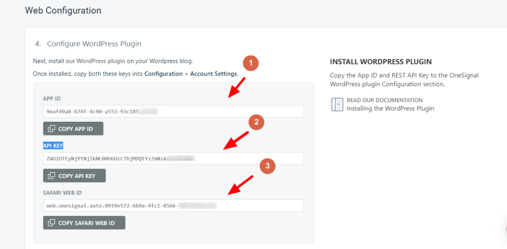 ستظهر لك نافذة تحتوي على مجموعة من البيانات ومن ضمنها APP ID و API KEYو SAFARI WEB ID الخاص بتمكين إرسال الإشعارات على متصفح سفاري، عليك بتركها كما هي ومن ثم التوجه لتثبيت الإضافة على الموقع الخاص بك.