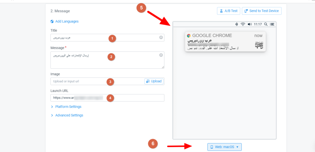 - Message: هي الرسالة التي تشرح مضمون الإشعار وما الذي سيحصل عليه المستخدمين بالنقر على الإشعار. على سبيل المثال من المٌمكن أن يكون " تعرف على طريقة تمكين إرسال الإشعارات على الووردبريس"