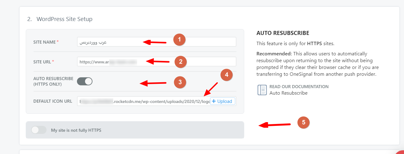 - AUTO RESUBSCRIBE: هذا الخيار يتيح الاشتراك التلقائي للمستخدمين عندما، يحذفون التخزين المؤقت للمتصفح أو عند تغيير إضافة إرسال الإشعارات إلى OneSignal، وهذه الميزة لا تعمل إلا في مواقع https.