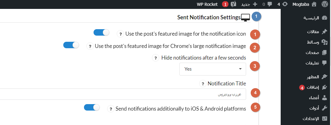 - Use the post's featured image for Chrome's: لعرض الصورة البارزة للمقال كخلفية للإشعار، مدعومة فقط في قوقل كروم.