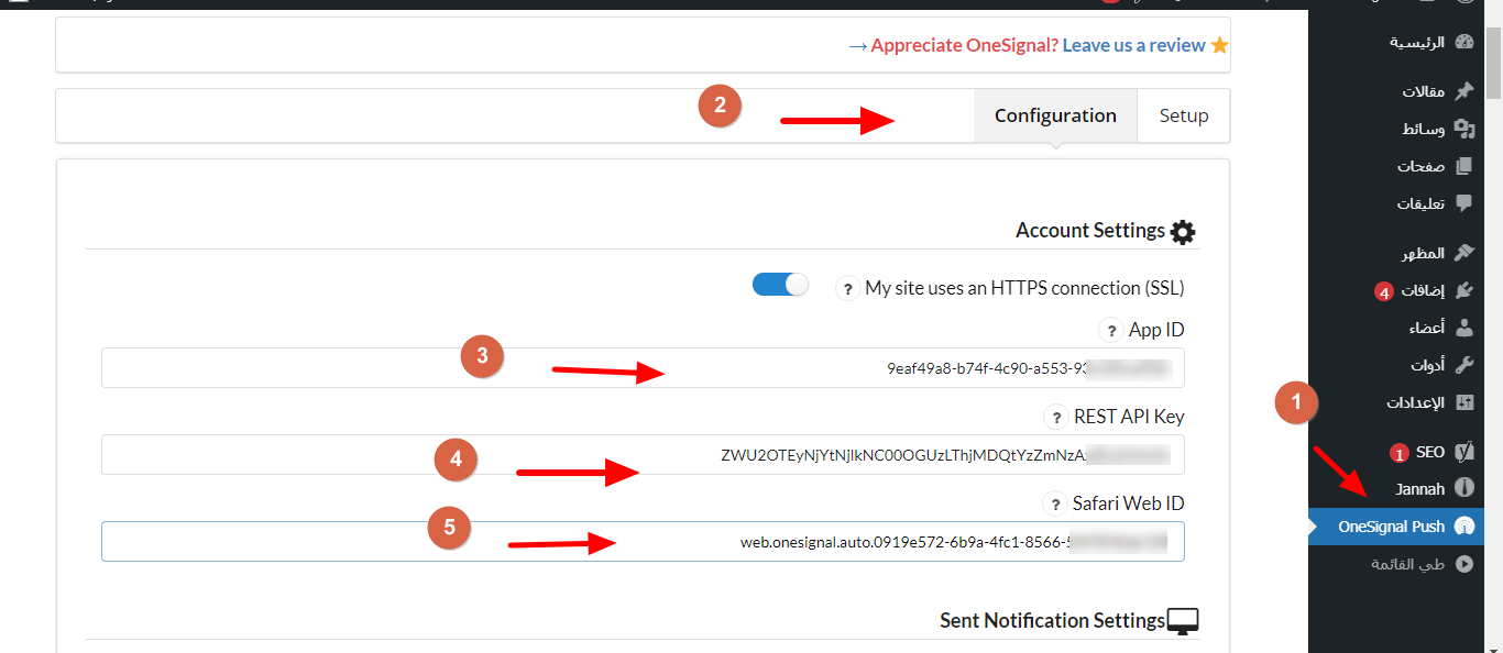 من لوحة تحكم الووردبريس، ستلاحظ أنه تمت إضافة خيار OneSignal على القائمة اليُمنى من الشاشة، انقر عليه، ومن ثم حدد على Configuration، انسخ البيانات الموضحة في النافذة السابقة وألصقها في الحقول الخاصة لها، ومرر لأسفل وأنقر على save.