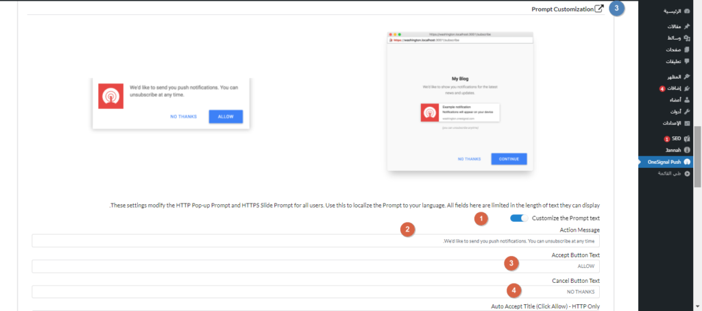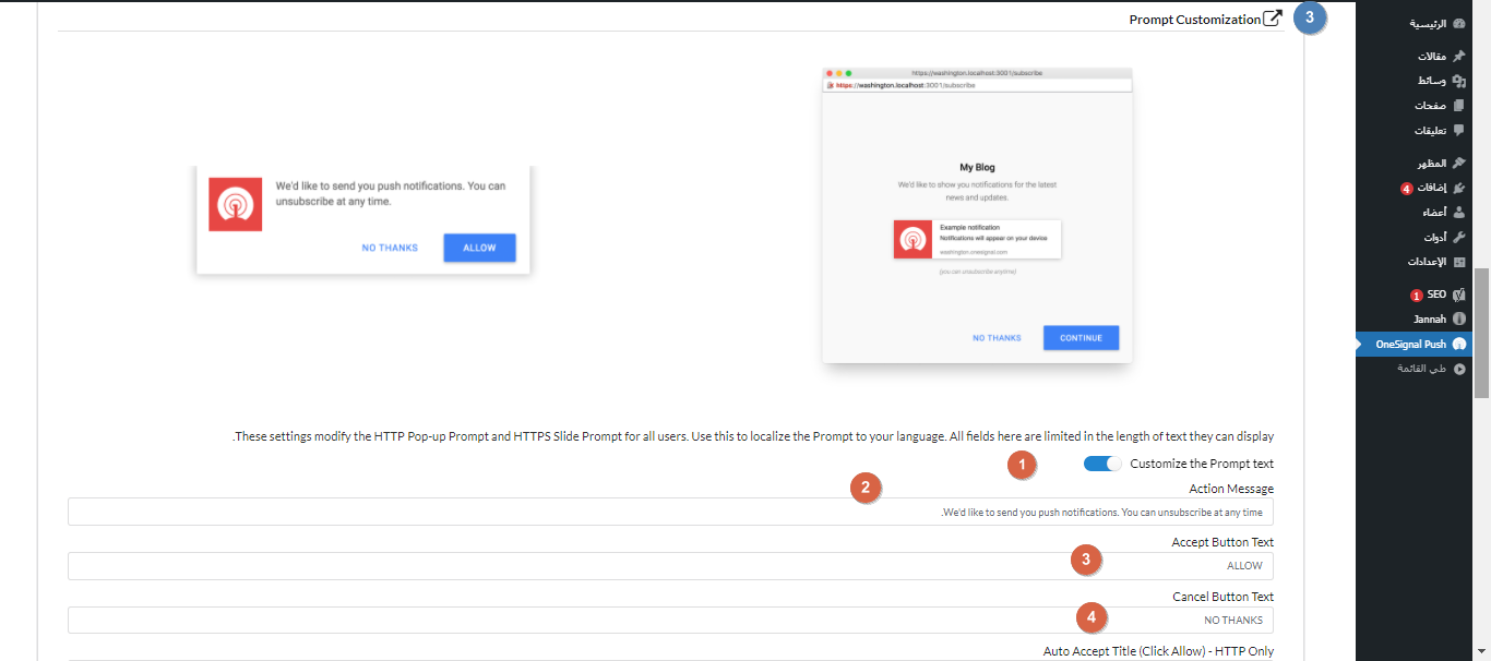- Customize the Prompt text: لتخصيص النصوص التي تظهر على الإشعارات التي تطلب من المشتركين الاشتراك.