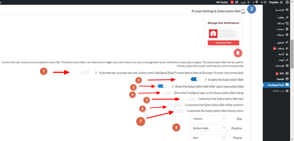 - Show the OneSignal logo: لإظهار شعار OneSignal على جرس الاشتراك.