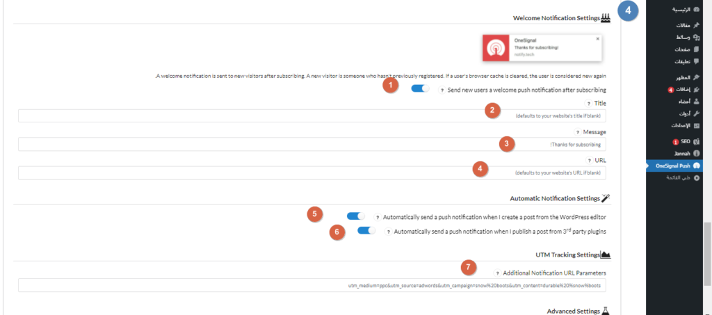 - Send new users a welcome push: من هذا الخيار بإمكانك تحديد إذا ما كنت تريد إرسال إشعار ترحيب للمشتركين أم لا.