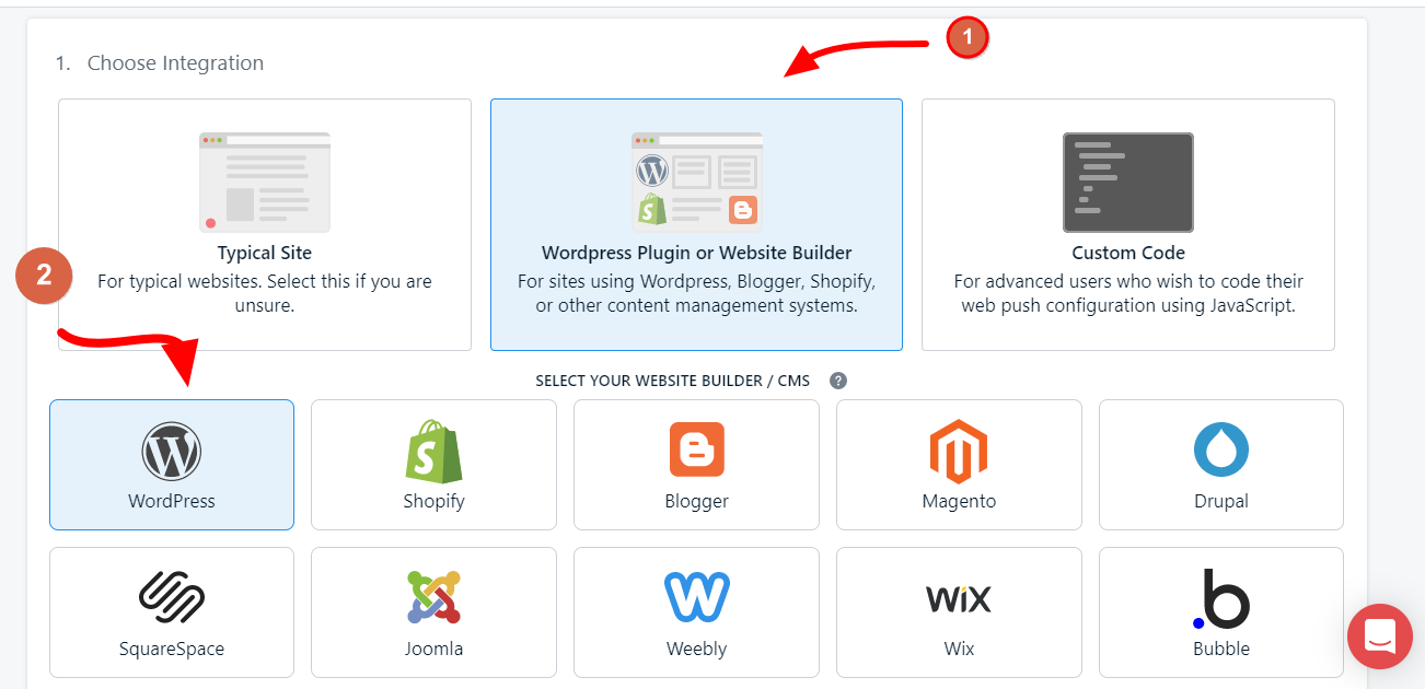 بعد ذلك، عليك باختيار نوع التكامل مع الموقع الإلكتروني الخاص بك، عليك بالتحديد على WordPress Plugin or Website Builder لمواقع الوودربريس، ثم حدد على WordPress في الأسفل.