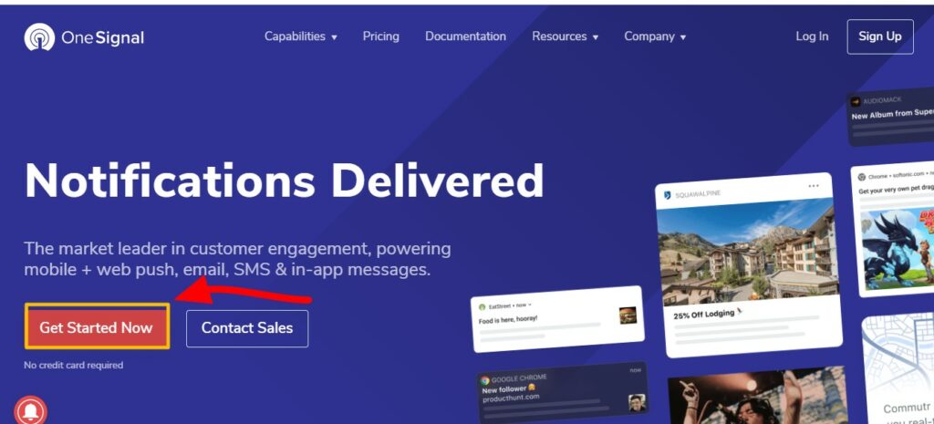 توجه إلى موقع onesignal.com، ومن ثم انقر على "Get Started Now".