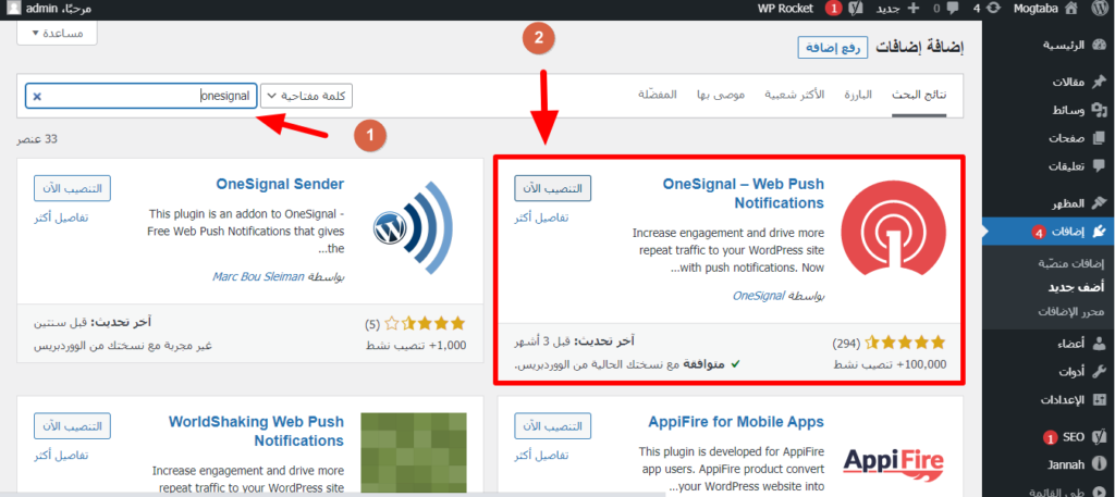 الخطوة الثالثة: تثبيت إضافة OneSignal