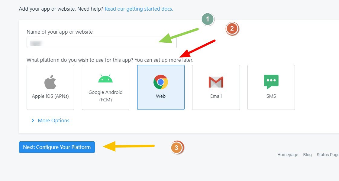 بعد الدخول مباشرة إلى حسابك على موقع OneSignal، ستجد أن هناك مجموعة من الخطوات التي يجب اتمامها لتمكين إرسال الإشعارات على الموقع الخاص بك، في البداية عليك أن تدخل اسم الموقع ومن ثم الشروع في تحديد المنصة التي تريد تمكين الإشعارات لها، وبالتأكيد نحن سنختار خيار "web"، ثم انقر على التالي (Next) في الأسفل.