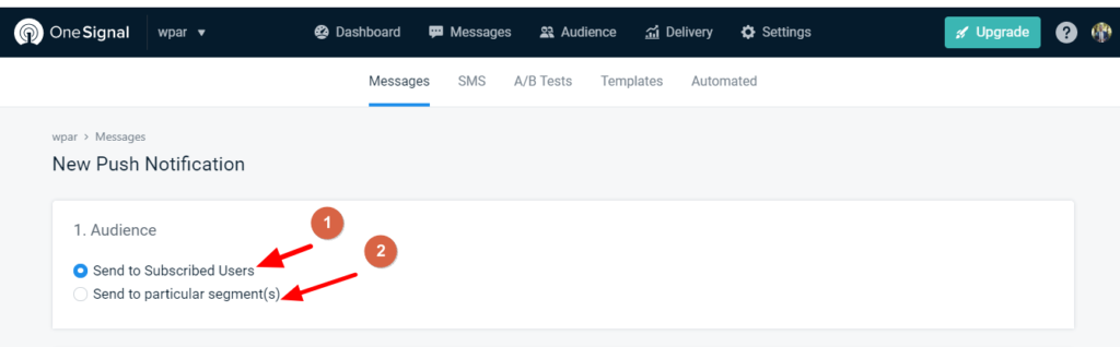 - الخيار الثاني يُمكّنك من إرسال الإشعارات إلى فئة محدد من المشتركين على سبيل المثال الأشخاص المشتركين عمومًا، أو المشتركين غير المتفاعلين، أو المشتركين المتفاعلين. أيضًا يتيح لك استبعاد بعض المشتركين من استلام الإشعار. وبالتأكيد نحن سنختار الخيار الأول لإرسال الإشعار إلى المشتركين في الموقع جميعًا.