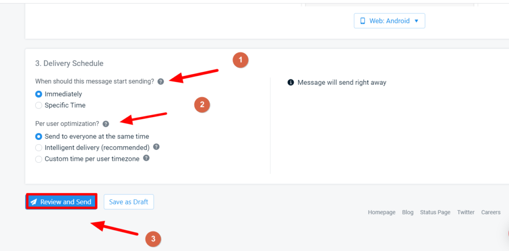 - الخيار الثاني يتيح لك إرسال الإشعارات لجميع المشتركين في نفس الوقت، أو الوقت الذي يتوقع فيه أن يكون المشترك نشطًا، أو حسب المنطقة الزمنية للمشتركين.
