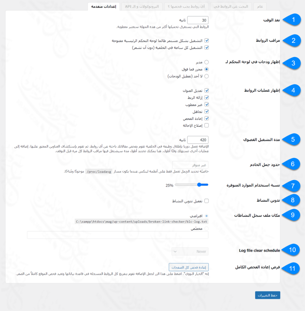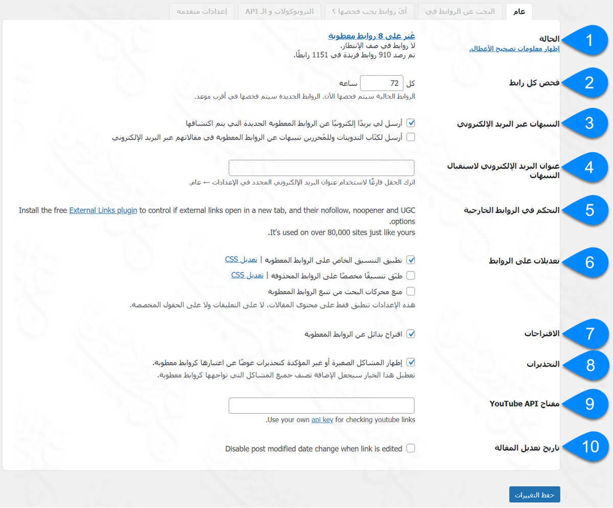 الإعدادات العامة في إضافة فاحص الروابط Broken Link Checker تتكون من 11 خيار مختلف، وتفسيرهم كالتالي:
