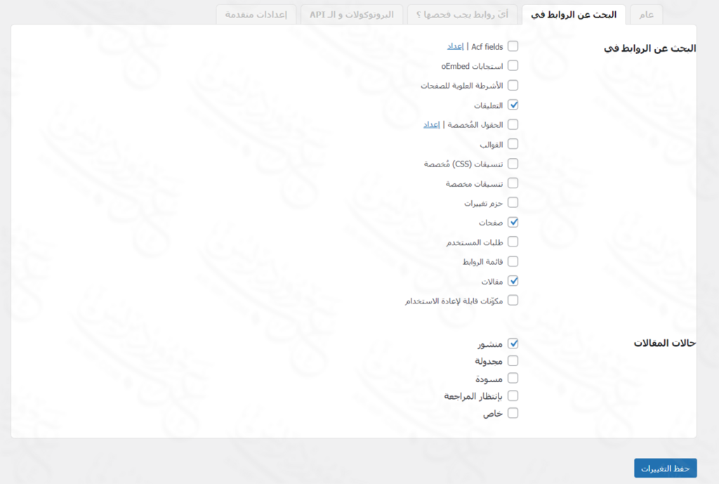 من هذا التاب يمكنك تحديد مكان عمل إضافة فاحص الروابط بالإضافة إلى حالات المقالات التي تسمح للإضافة بالعمل فيها. فمثلا كما ترى في الصورة أعلاه تم اختيار كل من المقالات والصفحات والتعليقات بشرط أن تكون حالتها منشور.