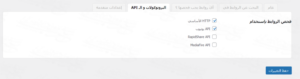 من هذا التاب ستجد البروتوكولات التي تستخدمها الإضافة في فحص وتحليل الروابط. البروتوكولات الافتراضية هي HTTP الأساسي، ويوتيوب API. ويمكنك استخدام البروتوكولات الإضافية إذا احتجت لها.