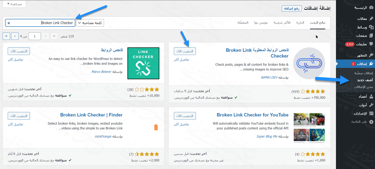 1 – الخطوة الأولى هي تثبيت وتفعيل إضافة فحص الروابط المعطوبة Broken link Checker، وهذا يتم بالطريقة البسيطة المعروفة عن طريق الذهاب إلى إضافات ثم اختيار أضف جديد ثم البحث عن الإضافة كما ترى في الصورة التالية.