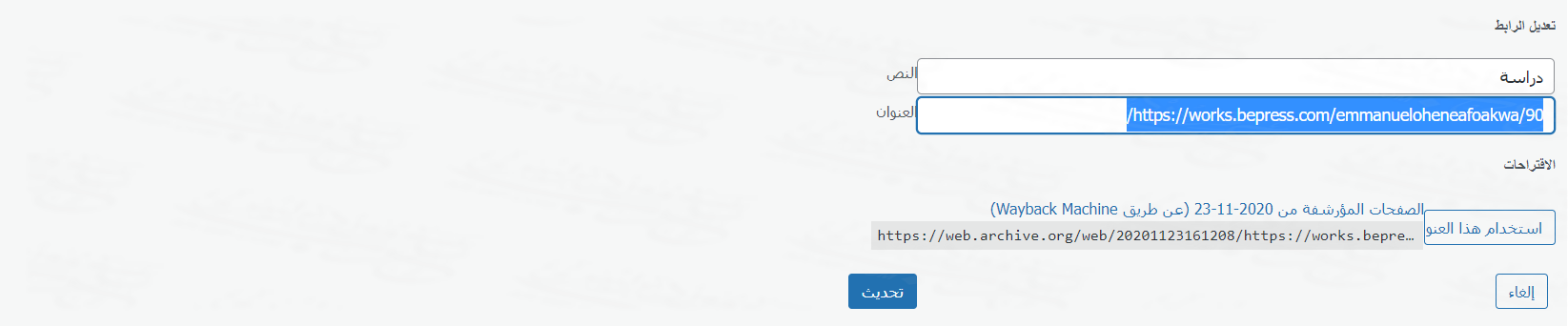 بمجرد الضغط على تعديل العنوان سيظهر لك النص والرابط المعطوب الموجود عليه، كما ستقترح عليك الإضافة عدة اقتراحات بديلة للرابط المعطوب إن أحببت استخدامها.
