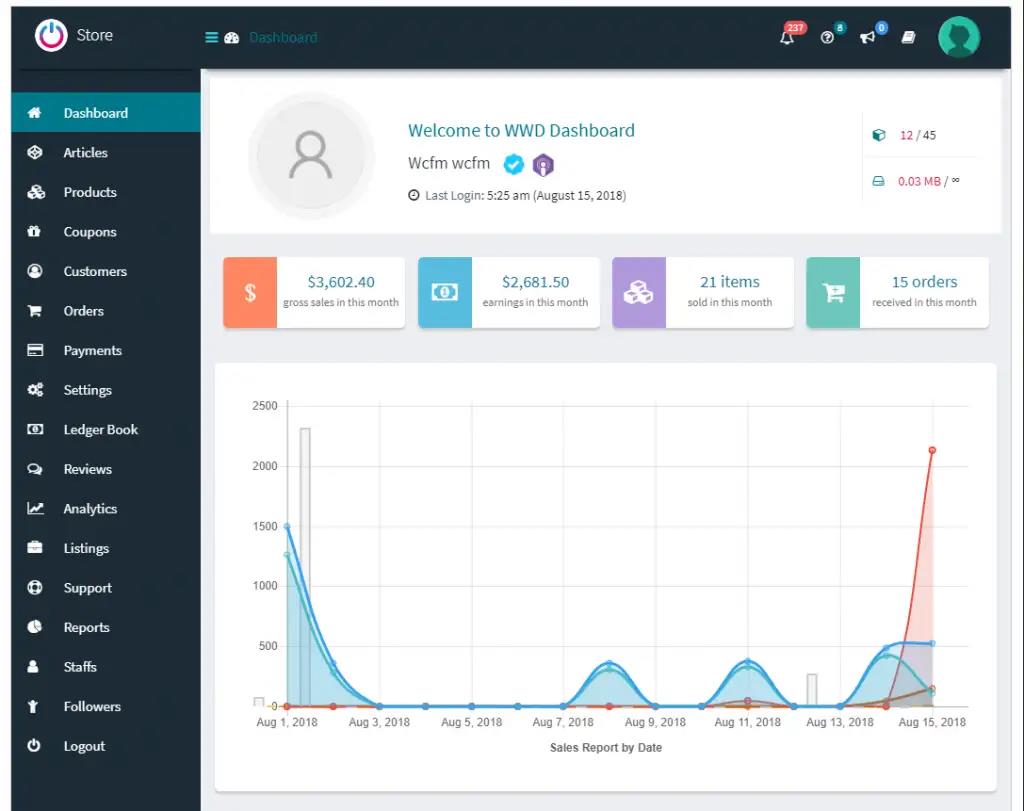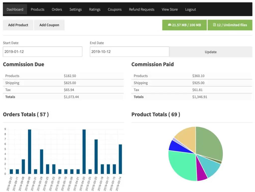عوضًا عن ذلك فهي تستخدم لوحة تحكم ووردبريس لمنح البائعين القدرة على إدارة متاجرهم وإضافة المنتجات وقراءة تقارير المبيعات وغيرها من المزايا. مع أنها توفر تقريبًا نفس المزايا التي تتيحها إضافات Dokan و WCFM إلا أنها تتخلف عنهم بوضوح عندما يتعلق الأمر بسهولة الاستخدام وأناقة تصميم الواجهات.