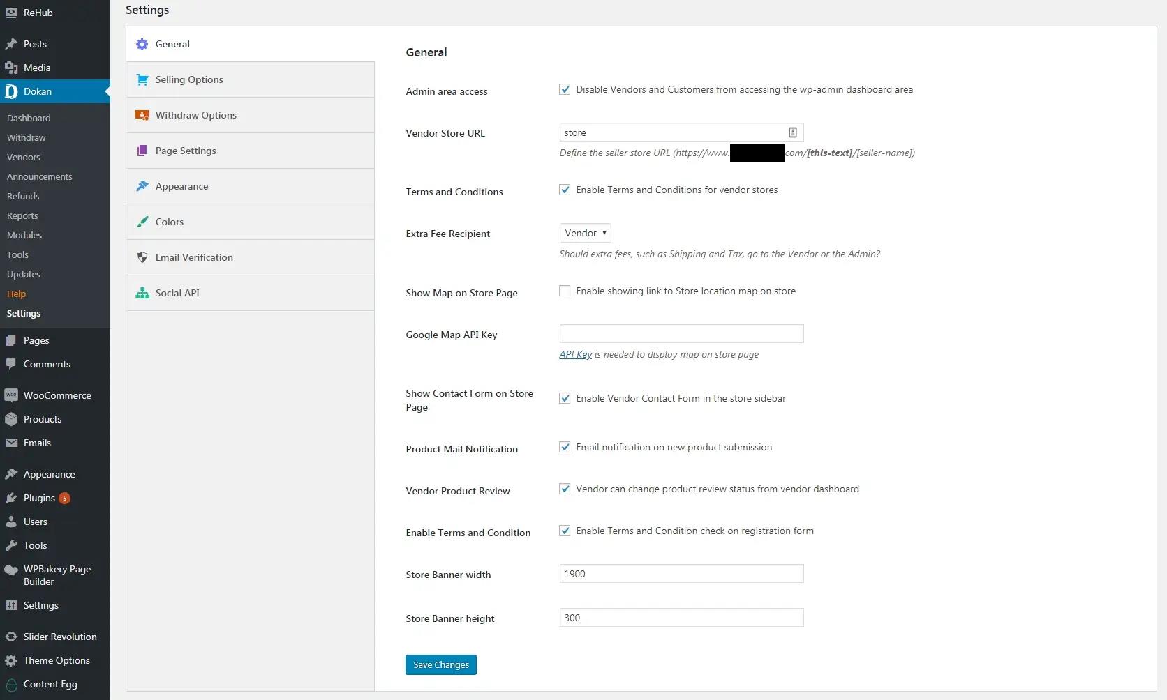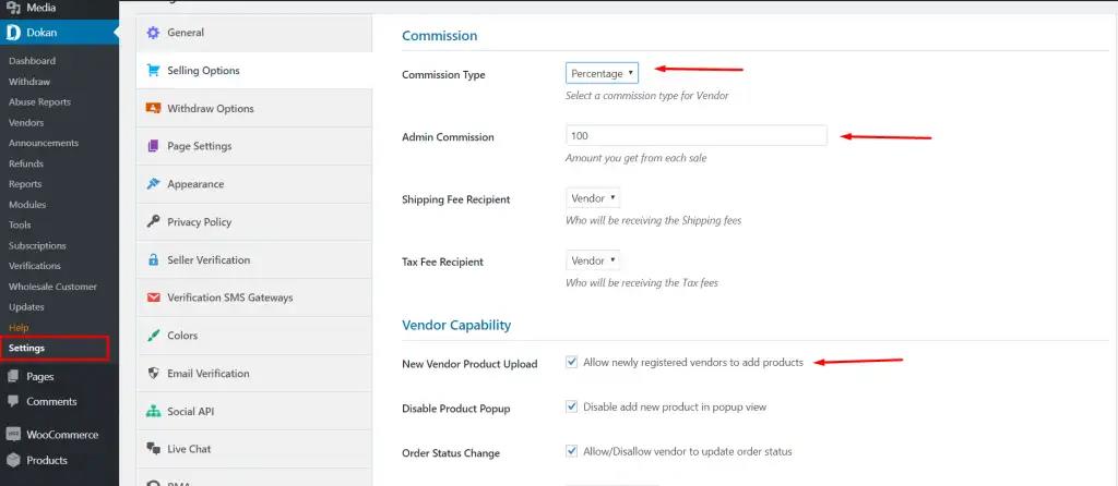 بالإضافة إلى الإعدادات الخاصة بإضافة ووكومرس سيكون عليك ضبط طريقة عمل متجرك عبر استخدام تبويب الإعدادات المرفق بجميع إضافات تعدد البائعين والموجود ضمن لوحة تحكم ووردبريس. تتعلق الإعدادات الأساسية بتحديد نسبة العمولة المتفق عليها وطريقة التعامل من التجار الجدد وكيفية السماح لهم بالتسجيل والبيع في موقعك.