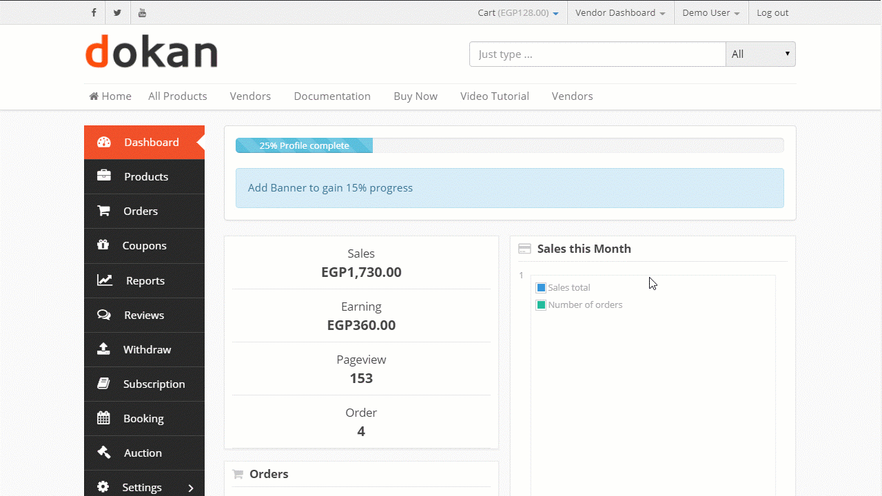 ومن الواضح أن لوحة تحكم إضافة Dokan الخاصة بالبائعين هي سبب شعبية هذه الإضافة؛ بفضل تصميمها الأنيق والمجموعة الواسعة من المزايا التي تتضمنها، وفي الحقيقة فهي المرشح الأول عندما يتعلق الأمر بإنشاء متجر إلكتروني متعدد البائعين على منصة ووردبريس كما يمكنك إضافة المزيد من المزايا إليها عبر استخدام الإصدار المدفوع وأدواته الإضافية.