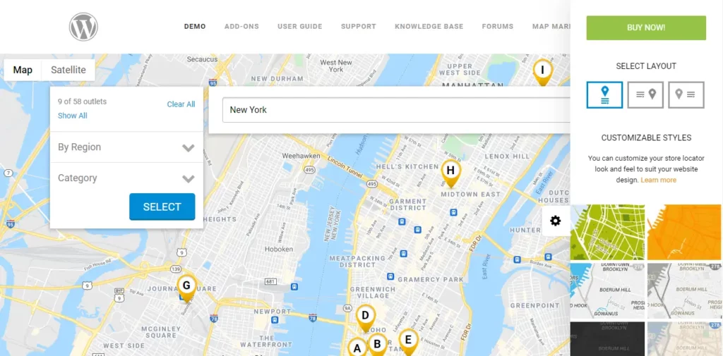 تم بيع هذه الإضافة حتى الآن أكثر من 2800 مرة وهي تحمل تقييم خمس نجوم من المستخدمين وتستطيع شرائها بـ 39 دولاراً فقط، لذا فهي تعد من أفضل إضافات محددات المواقع Locators في الووردبريس، كما أنها تحتوي على العديد من الميزات المهمة لمساعدة عملائك في الوصول إلى موقع متجرك بكل سهولة، ومن بين هذه الميزات ما يلي: