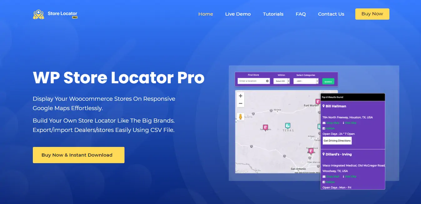 هذه الإضافة تعتبر من الإضافات متعددة الأغراض؛ فهي تسمح لك بإظهار المواقع القريبة من عملائك وزبائنك، وتأتي مع خلفية قوية حيث يمكنك تحميل مواقع متاجر متعددة دون معرفة إحداثيات خطوط الطول والعرض الخاصة بها، وقد تم بيع هذه الإضافة حتى الآن 518 مرة ويمكنك شرائها بحوالي 19 دولار فقط، ومن أهم ميزاتها ما يلي: