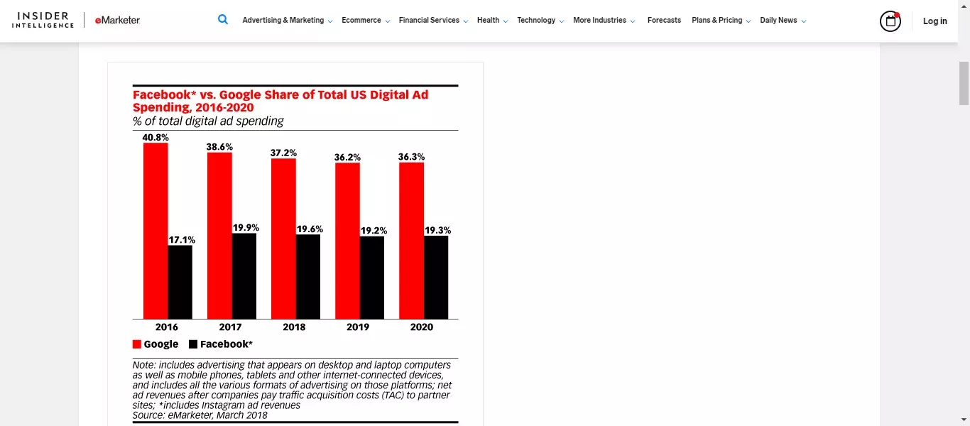 يمتلك Facebook ما يقرب من 20 ٪ من حصة السوق من إجمالي الإنفاق على الإعلانات الرقمية في الولايات المتحدة. في الواقع، كان من المتوقع أن تحصل كل من Google و Facebook على 56.8 ٪ من الاستثمار في الإعلانات الرقمية هذا العام.