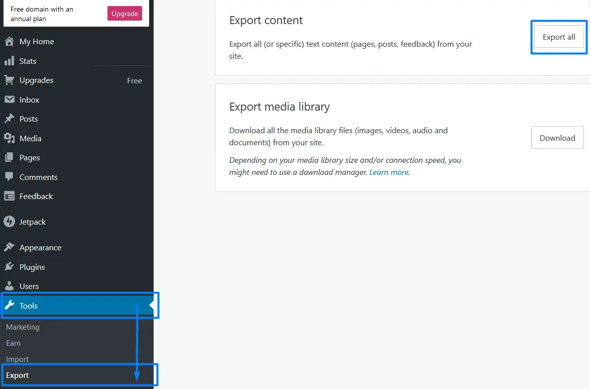 عند الضغط على (Export All) سوف يتم تحميل كافة مكونات الموقع على هيئة مِلَفّ XML يضم كافة التدوينات، والتعليقات، والصور، والصفحات، والأقسام، وكل شيء تقريبًا.